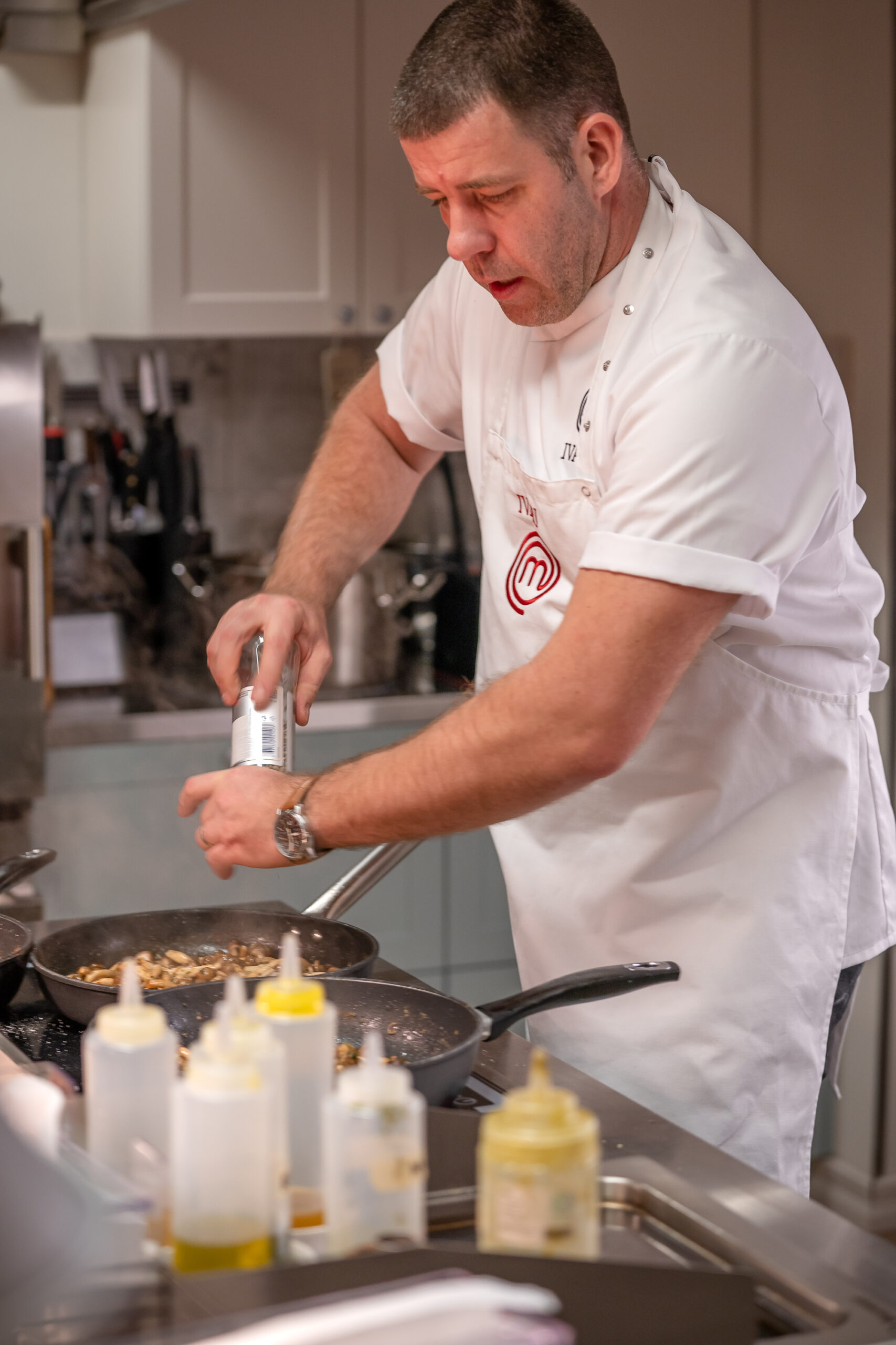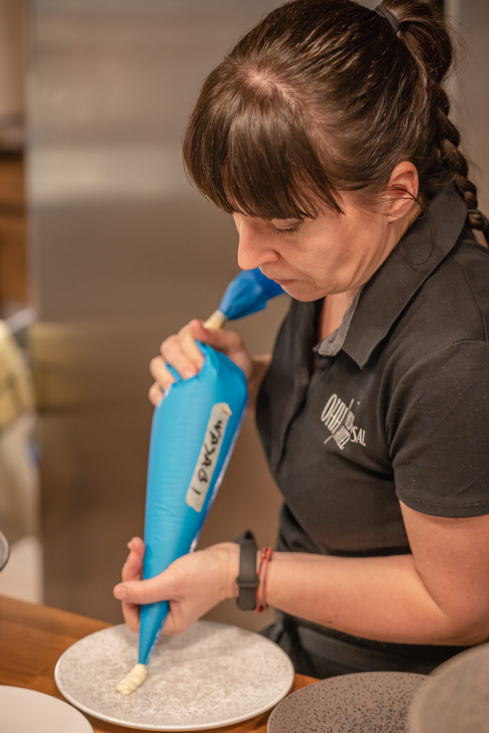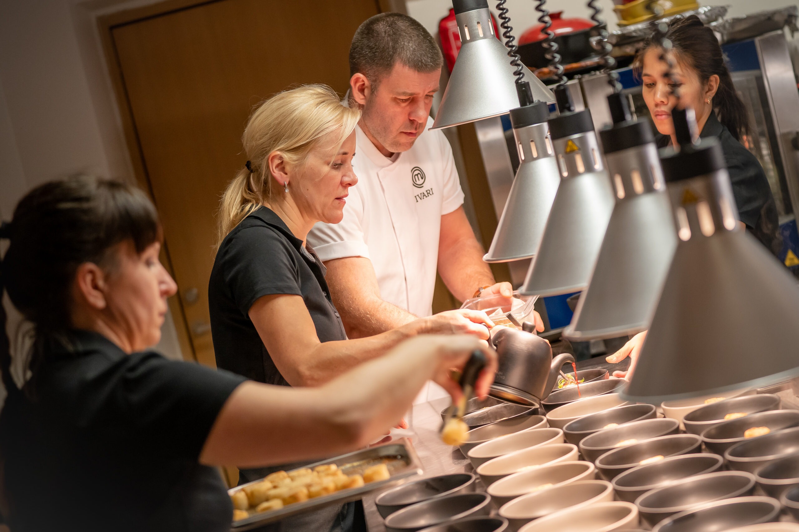 Masterchef saabus Haapsallu päev varem, et ettevalmistustega varakult peale hakata. Laudakandega 5-käigulise ning üsna tehnilise menüü ajastamine 40-le inimesele on omaette pähkel, mida igaüks ei pure! Ütlen ausalt, mina olin hetkeni, kui Ivari OHH kööki astus, üsna hirmul – kas ikka jõuame õigeks ajaks valmis? kas taldrikud ja toit sellel püsib soe, kuniks külalise ette jõuab? on ikka Ivari nii jutukas suure hulga inimeste ees nagu välja paistab? oskab ikka Ivari nii hästi süüa teha nagu saates mulje jäeti? Need hirmud haihtusid esimeste töökäskude ja ülesannetega, mis köögis laiali jagati – konkreetne, teadlik, rahulik ja mõnusa huumoriga vürtsitatud juhtimisstiil ning ülimalt chill õhkkond köögis teeb silmad ette nii mõnelegi tippkokale, rääkimata tulemusest taldrikul!