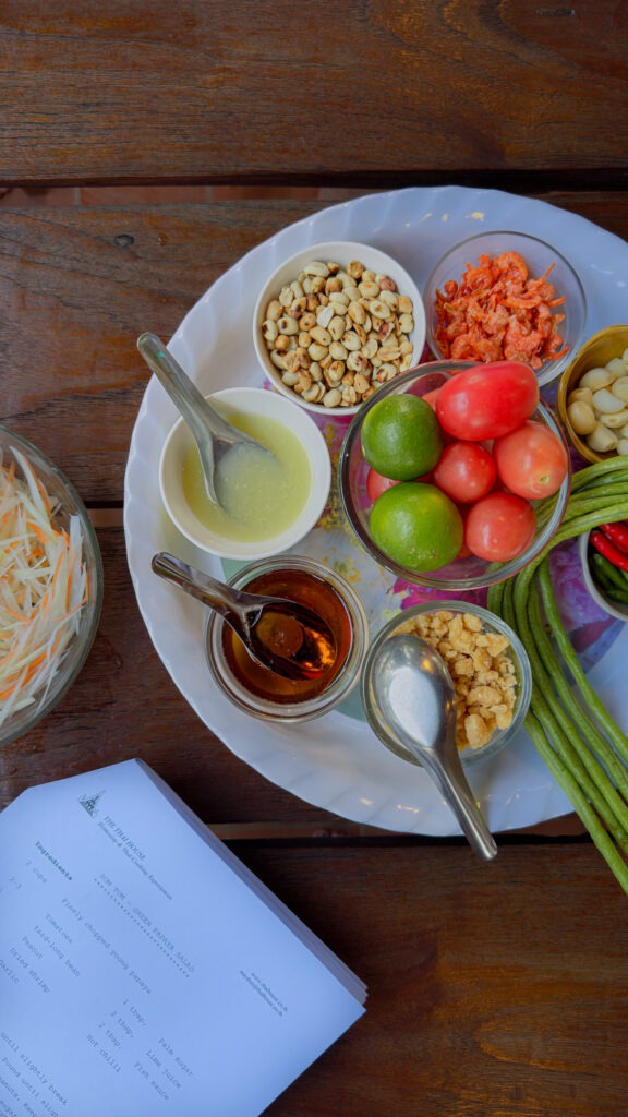 Kõrvale valmistan papaia salati, millest ma siiani suurt midagi ei arvanud Purustan uhmris küüslaugu ja kõige väiksema ning teravama Tai tšilli, mida nad ise kutsuvad ‘rat shit’iks. Lisan röstitud maapähklid, laimimahla ja kalakastme, tomati, riivitud porgandi ja rohelise papaia. Natuke palmisuhkrut, kuivatatud krevette ja kogu see segu muutub korraga plahvatuslikuks maitsetemölluks. See on enneolematu, kui maitsev!