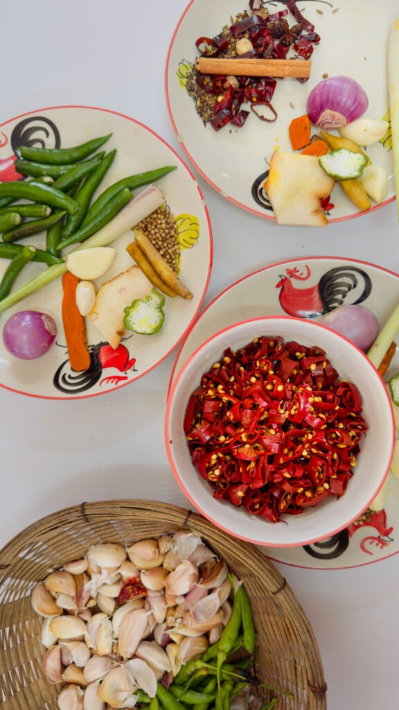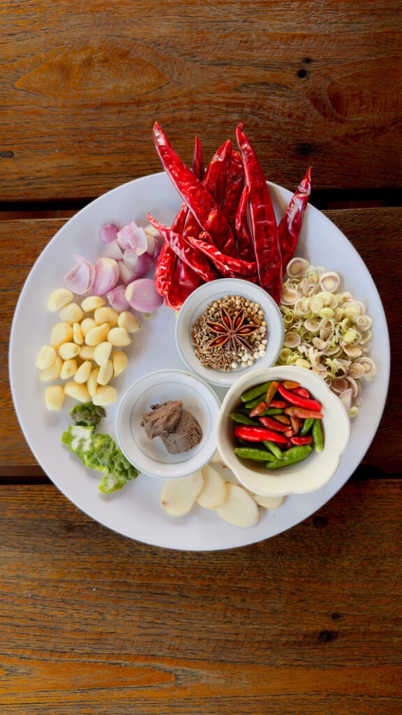 Siin ei kasutata magusat, soolast või haput eraldi, vaid pannakse need kõik omavahel kokku mängima ja seda mitte meile tuntud traditsiooniliste maitsestajatega. Magusus tuleb sageli palmisuhkrust, mis on pehme ja karamelline, mitte liiga magus. Soolasus ei tule niivõrd lisatud soolast, vaid kalakastmest või sojakastmest, mis annavad roale ka sügavuse. Hapu sünnib värskest laimimahlast või tamarindist, teravus värskest tšillist, mis annab roale särtsu ja äratab maitsemeeled ellu. Umami, see viies mõõde, tuleb kuivatatud krevettidest või krevetipastast, just see annab roale äratuntava Tai iseloomu. Tai köögis maitstakse, timmitakse ja kohandatakse pidevalt: tilk kalakastet, väike pigistus laimi, lusika otsaga magusat. See on pidev dialoog panni ja sinu maitsemeelte vahel. Just seetõttu võib üks lihtne karri või papaia salat tunduda sulle täiuslik, sest tasakaal on paigas.