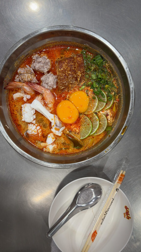 Oma reisi viimasel päevalotsustame taas sammud seada legendaarsesse Tom Yumi toidukohta ning olles juba nutikamad paneme oma nimed kirja ning seame sammud lähedalasuvasse katusebaari, kus veedame aega toredate baarmanide poolt valmistatud kokteilide saatel. 1,5 tundi hiljem astume Jeh O Chula uksest sisse. Ruum on rahvast pungil täis, ukse taga vookleb ilmatuma pikk inimsaba. Tellime erinevaid eelroogi ning nii Instagramis kui TikTokis kuulsaks saanud nuudlisupi, kus tavapärasele Tom Yum supile on lisaks krevettidele ja lihapallidele lisatud instant nuudlid ja munakollased. Munakollased peavad mõne minuti supil lebama, misjärel sööja need supi sisse segab, kasutades selleks söögipulkasid. Munakollase lisamine annab supile mõnusalt kreemise tekstuuri, supi puljong on võrratu! Kas nüüd need ‘kukesupi’ nuudlid just need on, mida mina tahaksin aga mida tean mina nende miljonite tiktokkarite kõrval 😉