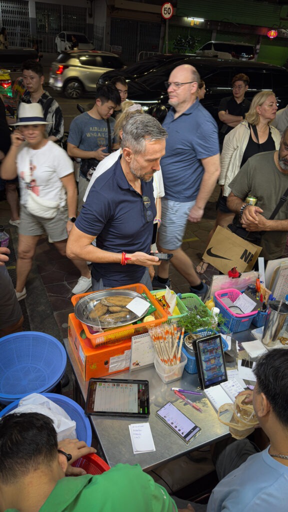 Pärast hingematvalt ilusa kuldse templi külastamist ja mõnusat kongide kolistamist püüame me laua saada Jeh O Chula nimelisse toidukohta. Tegemist on legendaarseima kohaga kogu Tai toidumaailmas, mille signatuur roaks on Tom Yum Mama nuudliroog. Silma hakkavad punased Michelin Guide kleebised, justkui uhke toidupreemiate tapeet oleks seintele kleebitud. Kohtade broneerimine käib rangelt elava järjekorra alusel. Me oleme kursis, et tunnike ootust elavas järjekorras on siin tavaline.