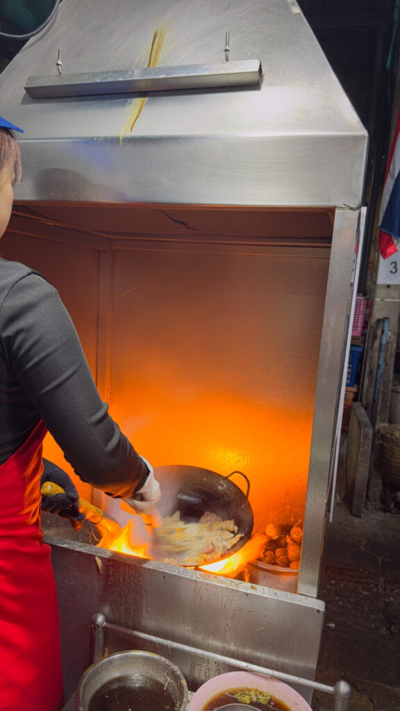Jätame Tom Yumi ja Mama nuudlid ning kõnnime mööda kitsaid tänavaid, mis päevasel ajal on ilmselt turg. Äkitselt ilmuvad meie ette kaks suurt grillahju, elav tuli leegitsemas nende põhjas. Hämaras ja inimtühjas nurgataguse toakese ees valmib nuudliroog… ohh, see on nagu kõigi maitsete pidu ühel taldrikul: kõik viis põhimaitset, lisaks suitsune järelmaik. Me tellime ühe portsu ja siis veel ühe sest see on lihtsalt nii maitsev.