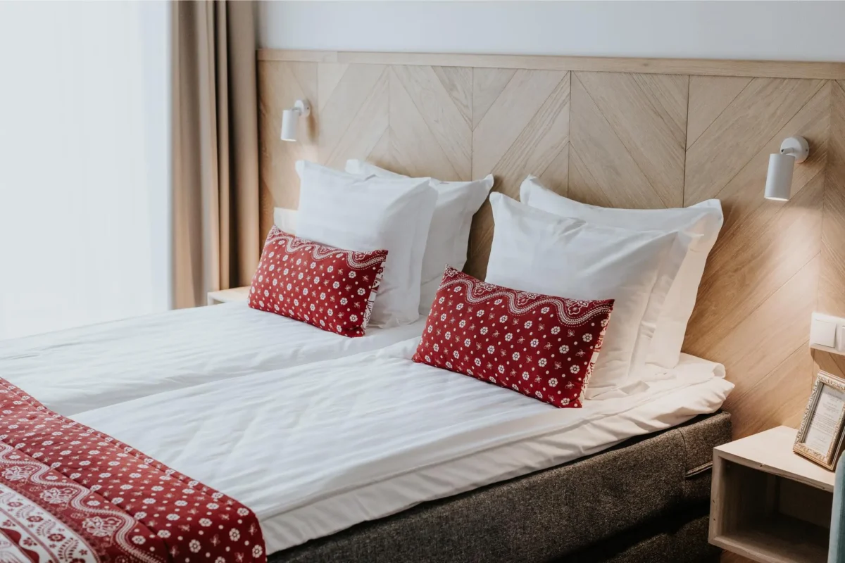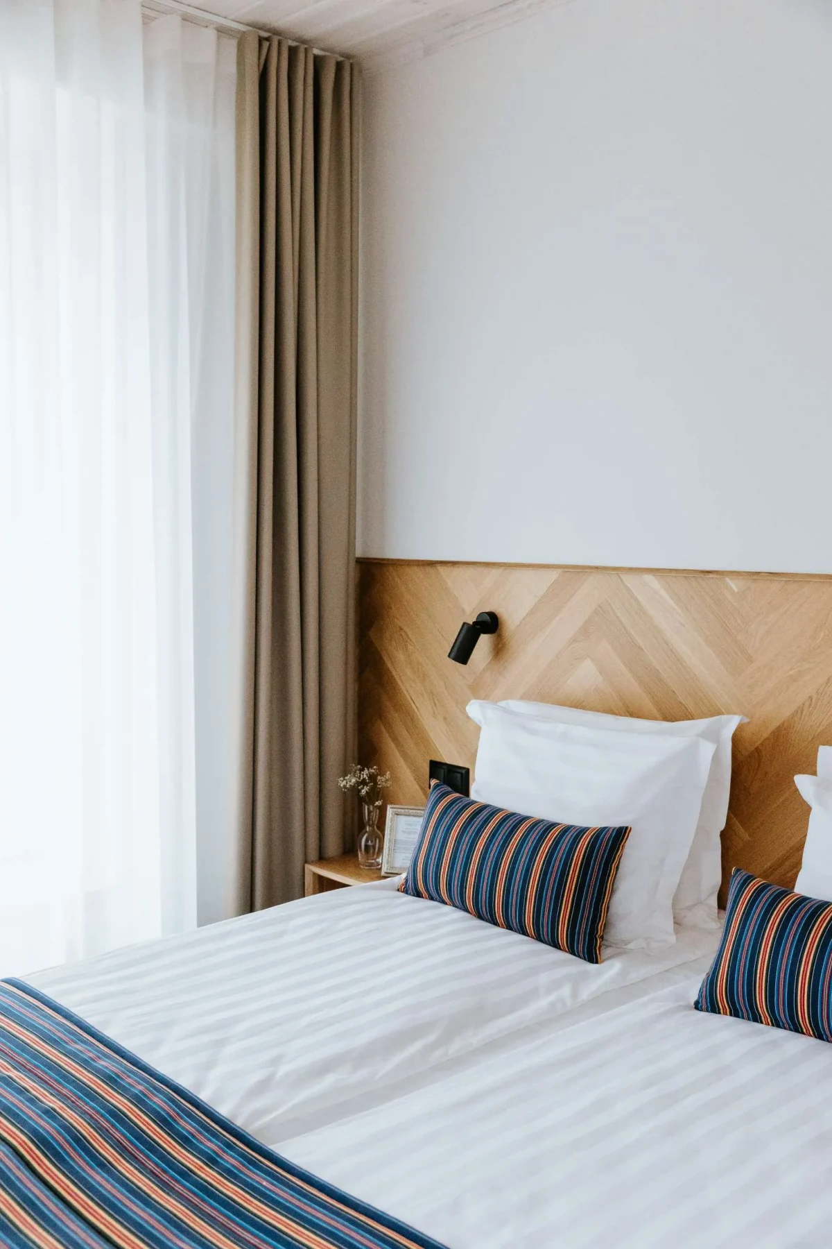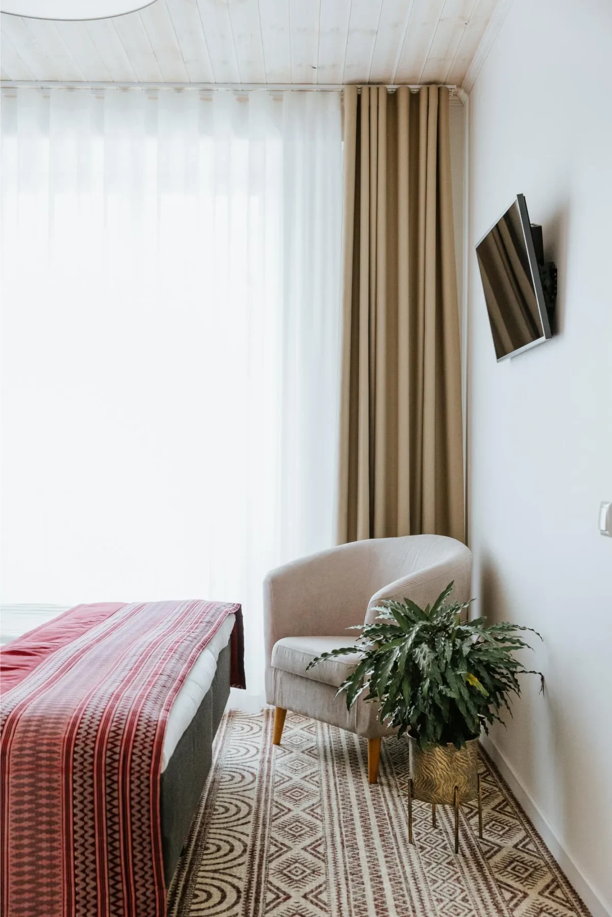 Toas ootab sind lai Sleepwell voodi (180 × 200 cm, soovi korral kaks eraldi voodit mõõduga 90 × 200 cm), pimendavad kardinad, vaipkate, suur peegel, riidenagi ja hubane istumisnurk. Pesuruumi ovaalne aken muudab toa eriti valgusküllaseks ja lisab romantilist õhkkonda.