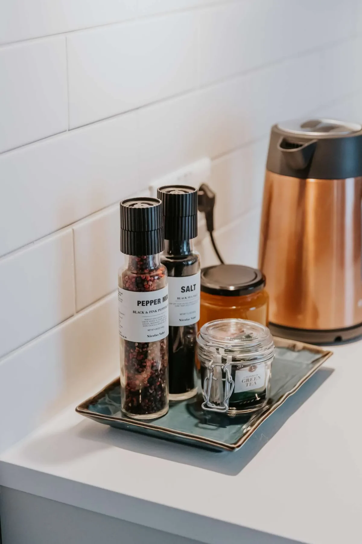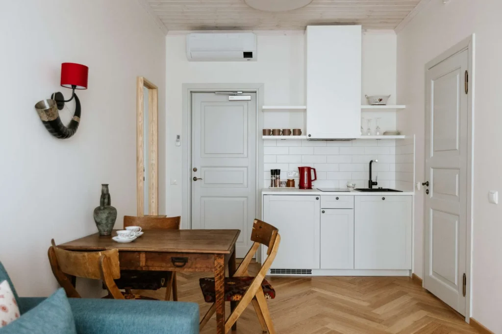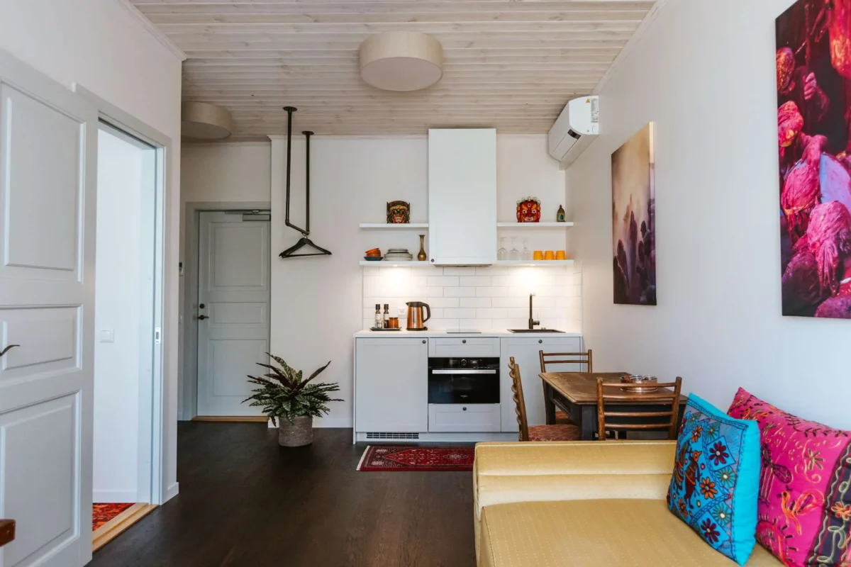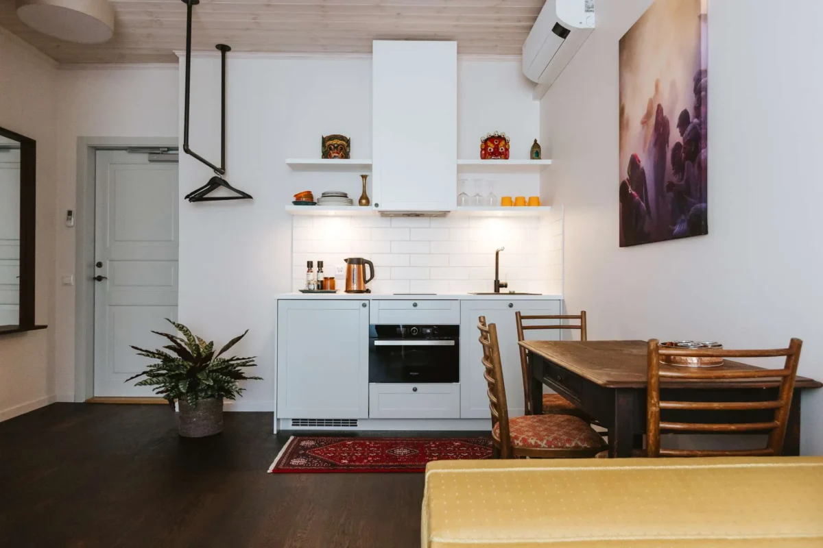 Eestoas on kööginurk koos pliidi, külmiku ja nõudega, lisaks minibaar. Samuti on toas väike televiisor, mugav istumisnurk ja diivanvoodi kahele külalisele. Interjööris on kasutatud unikaalseid mööbliesemeid, millele Eesti käsitöömeistrid on andnud uue elu.